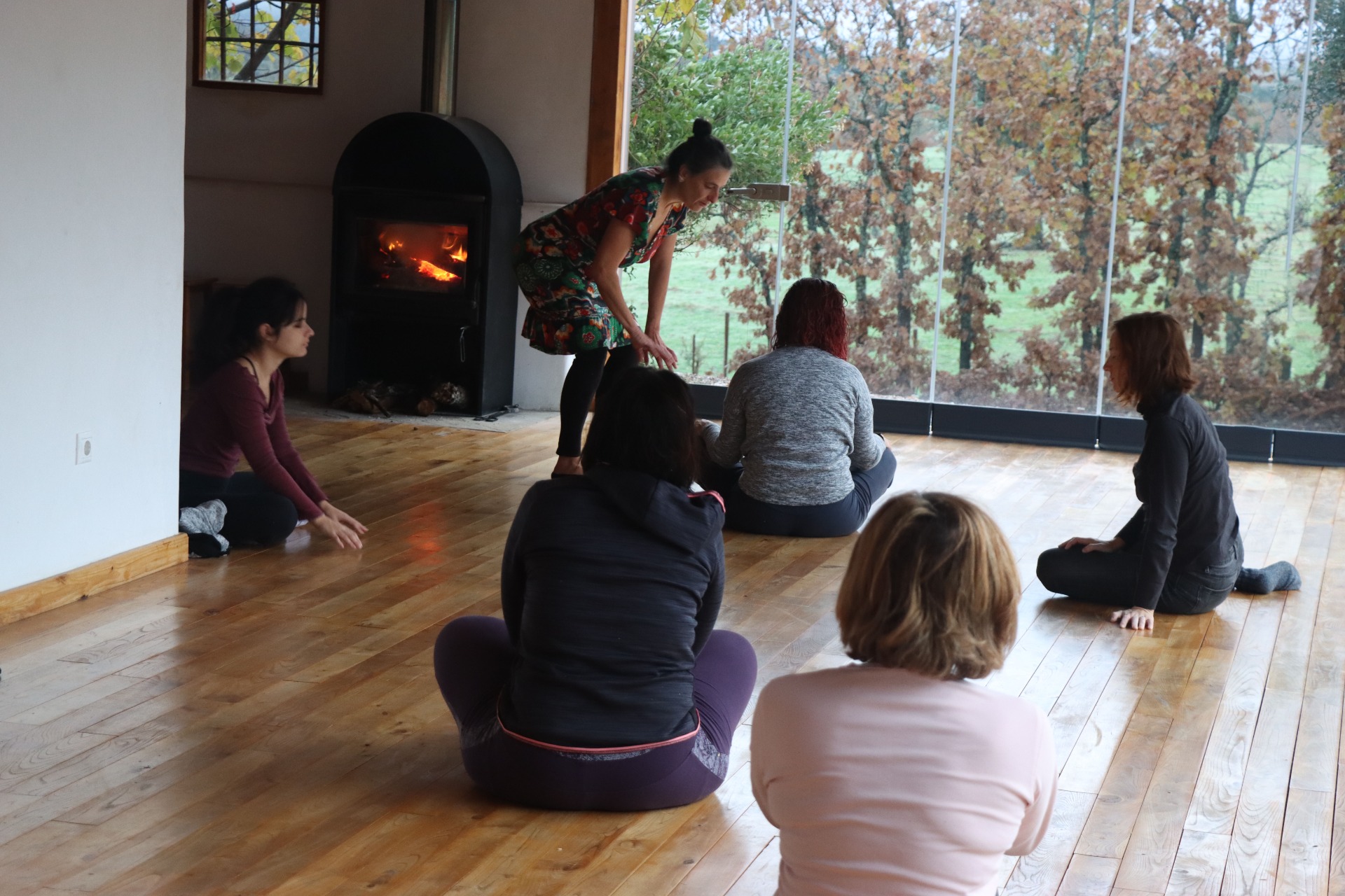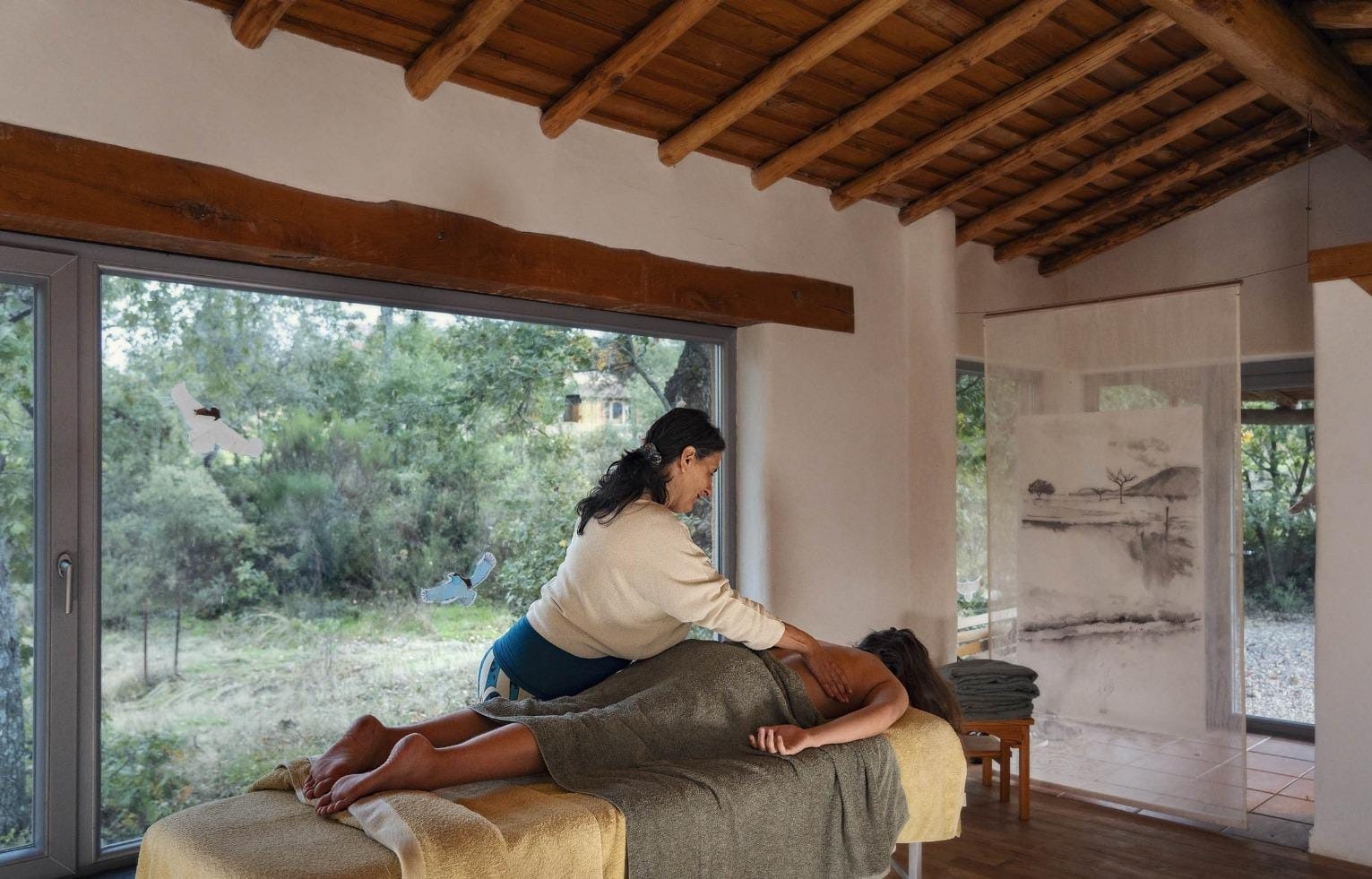 Utiliza los 5 sentidos para hacer una inmersión profunda a tu cuerpo en la comodidad de la sala indoor con vistas hacia el robledal que la rodea mientras lo invade sonidos de naturaleza, olores aromáticos y mirada al horizonte de sierras del Geoparque.