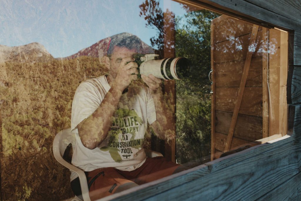 Junto a un bebedero bien surtido de comida, el biólogo de Photo Logistics Eugenio Martínez nos acomoda dentro de un hide de observación. “Un hide es un escondite en el que las aves no pueden vernos, de manera que conseguimos un acercamiento a las aves que sería imposible caminando por el monte o por el campo”, nos cuenta Eugenio. Hay diferentes hides repartidos por Sierra Espuña para poder ver toda la variedad de especies de la sierra, entre ellas al águila real, la reina de las aves. Para realizar este tipo de experiencias, recuerda Eugenio, “es imprescindible estar acompañado de un guía, lo que además nos dará cierta seguridad de conseguir nuestro objetivo, que normalmente es la fotografía de aves. Y, además de conocer la biología y la ecología de estos animales, conocen el territorio, y se encargan de realizar todo el trabajo previo, como el mantenimiento de los hides o el cuidado de los comederos y bebederos”.